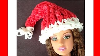 バービーちゃんが被れるサンタ帽子を作成するチュートリアル。フックに毛糸を編むかぎ針を使用しています。